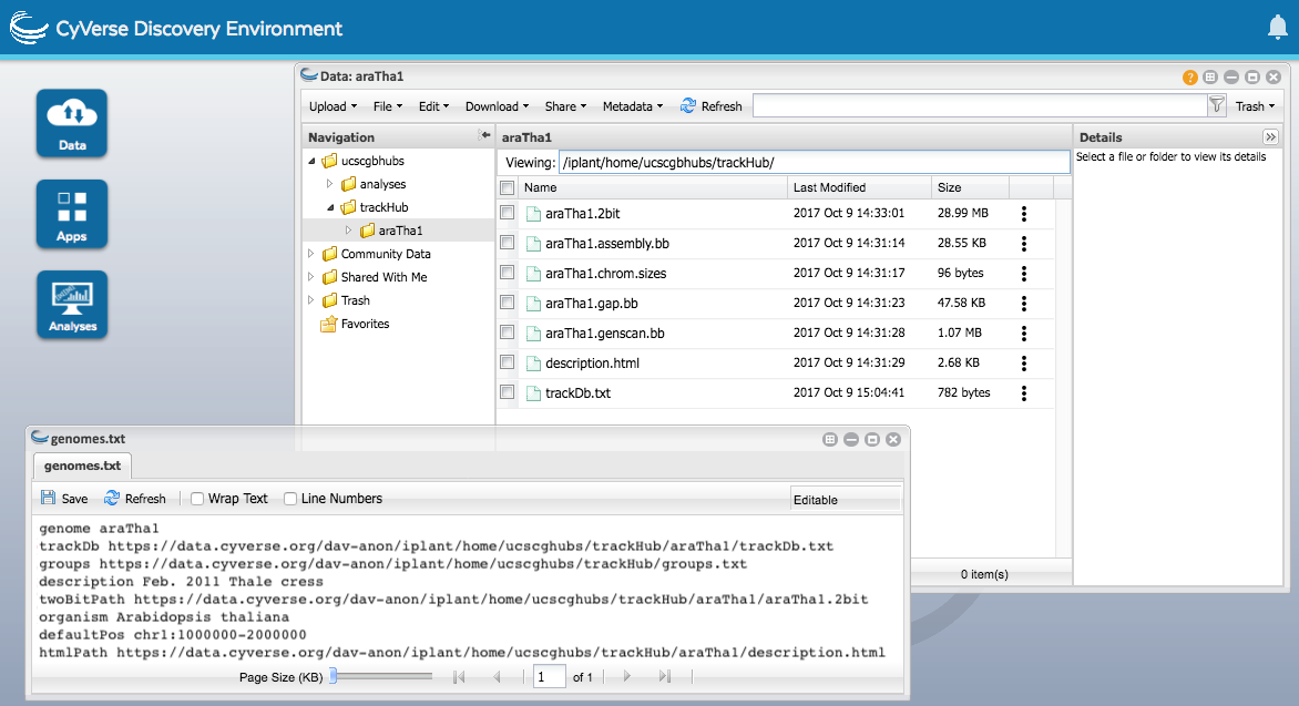Please see the Viewing Genome Files in a Genome Browser wiki page on the CyVerse wiki for more information (please note the difference of the Data Commons for final curated publication material, and the Discovery Envirnoment for developing data). Please direct any questions about CyVerse or the Discovery Environment to their Ask CyVerse page or contact Cyverse support staff directly via the blue Intercom button on the bottom right of the Discovery Environment page.