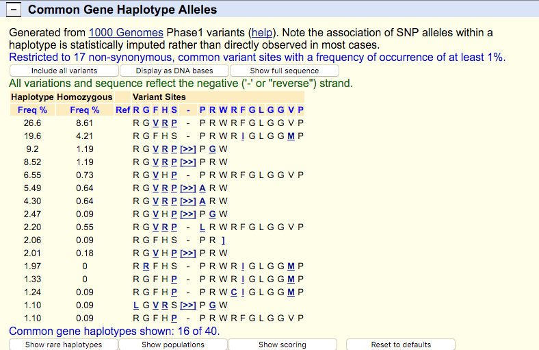 By clicking into the gene track for one of the isoforms of the ABO gene one can see additional variant details by clicking the "Gene Alleles" link to jump down to the "Common Gene Haplotype Alleles" section and mouseover highlighted variant amino acids to see changes in nucleotide and AA sequences.