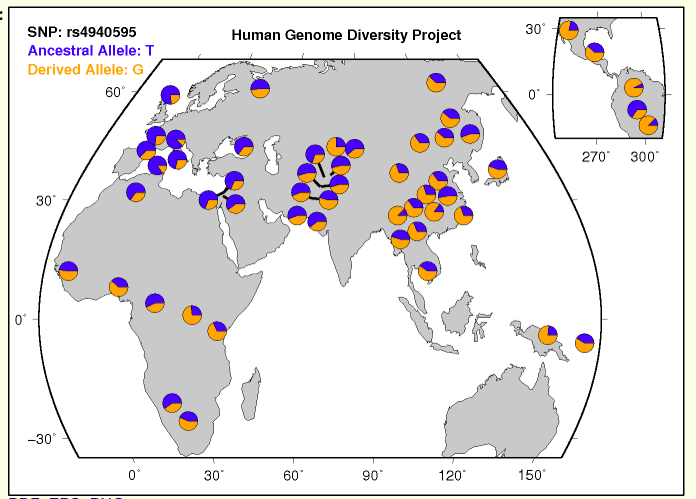Clicking the top highlighted rs4940595 in the Human Genome Diversity Project SNP Population Allele Frequencies track will display the world frequency image regarding this variant. In the more recent hg38 reference genome this area displays differently. Click into the active session and then into the SNP to read the details. Link to region in hg38 for comparison. Specifically, in hg38 the T in the previous reference assembly has been replaced by a G, giving the reference a glutamic acid, E, and no longer prematurely truncates the predicted transcript. The SNP at this location, rs4940595, now indicates the G > T transversion in the reverse direction from previously, indicating a premature stop at this location for the T allele.