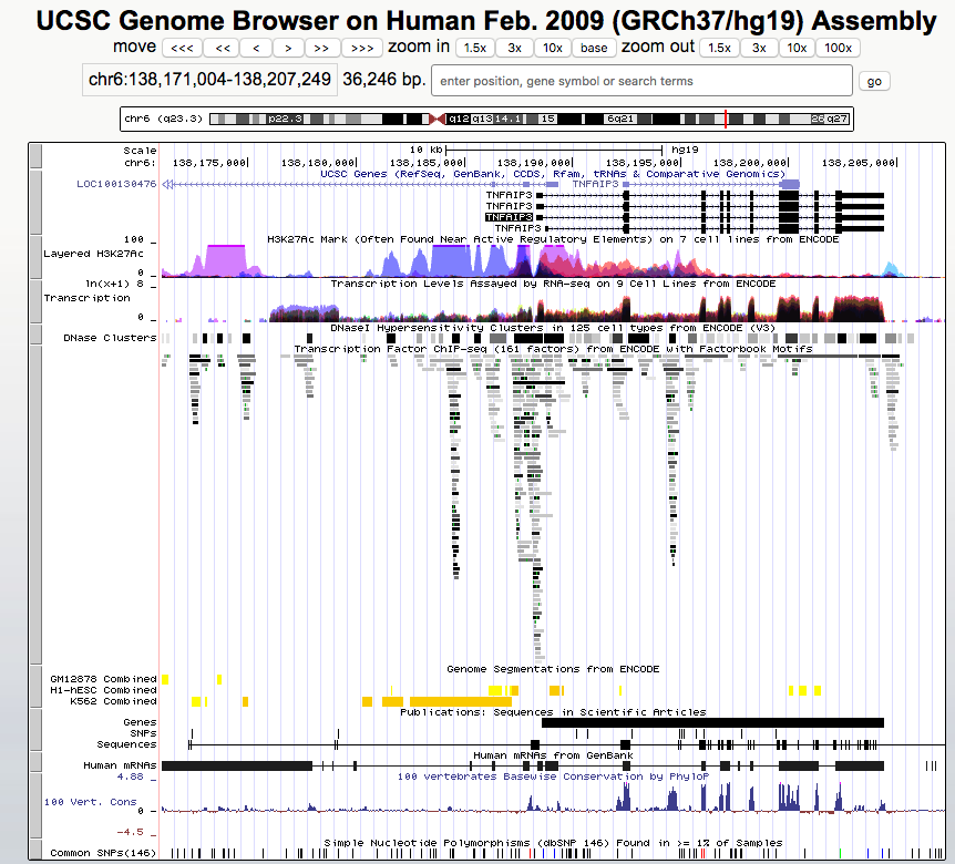 This session comes from a question regarding how to search for enhancer RNA for the gene TNFAIP3. The response displays the various ENCODE tracks around the gene TNFAIP3 indicating where DNase activity, Transcription Factor Binding, RNA transcription, and histone modification has been observed. The layered H3K4Me1 and layered H3K27Ac tracks show where modification of histone proteins is suggestive of enhancer and other regulatory activity. Investigating where RNA-seq signals overlap with Transcription Factor Binding upstream of TNFAIP3 transcription would appear to indicate possible eRNA locations and the segmentation track displays possible Strong and Weak Enhancers as calculated by the ChromHMM and Segway programs.