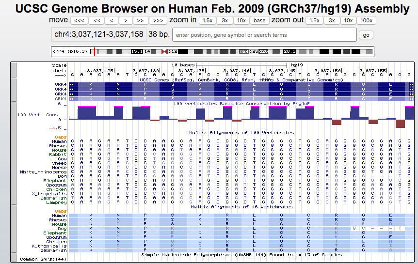 The above session helps illustrate how codon wobble in bases diverges through evolution when the amino acid is the same (note the conservation score graph). There is a conservation of function through evolution with V > I > F amino acids and K > R substitutions. Here is an additional example session displaying wobble.