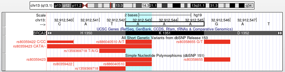 In Figures 1 and 2, the "UCSC Genes" track is displaying exon 11 of the BRCA2 gene. Below the "UCSC Genes" track are two "dbSNP" tracks, "dbSNP153" (upper) and "dbSNP151" (lower); these two tracks are different iterations of the same rsIDs and data, with some differences between the two data releases. The two tracks have different details available when clicking on one track or the other. Checking both versions of the rsID, or "reference SNP" can provide a wide range of insight into a variant.