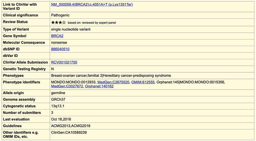 Clicking into the variant's ClinVar rsID annotation will provide further information on from ClinVar's data regarding the allele change. This brings one to the page shown in Figure 6 which reiterates previous information we have discovered about this variant, but it also supplies new details regarding the phenotypes associated with an allele change in this position of the genomic sequence. Next to "Phenotypes,", this variant is labeled as correlated with the development of "breast-ovarian cancer" and "hereditary cancer-predisposing syndrome", which is what BRCA2 is well known for.