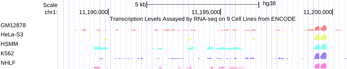 Negate values: When checked, all values in the wiggle are negated, meaning that positive values become negative and vice-versa. This is useful for wiggles representing transcription or other activities on the minus strand. Be aware that wiggles with negative values are drawn in altColor not color as positive values are. The below image shows ENCODE RNA-seq data around two genes on different strands, SIRT1 and HERC4, with a minus signal track using Negate values to flip the wiggle display to emphasize that HERC4 is expressed on the minus strand. This image also displays the signal graphed in points and a smoothing window of 16 pixels.